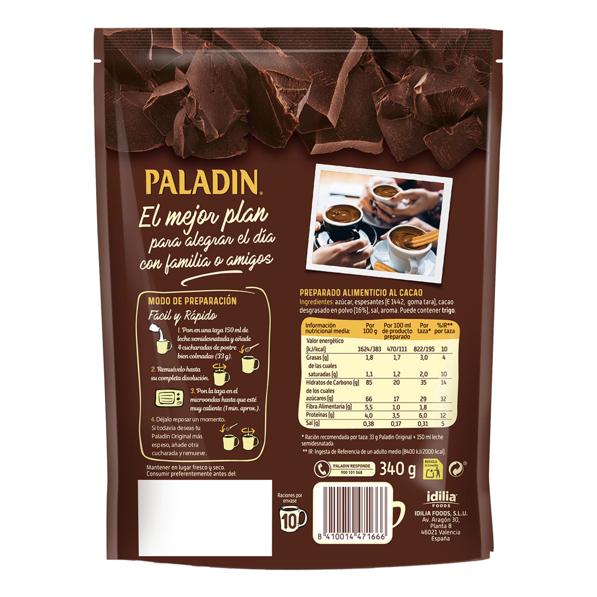 Le PALADIN Original est le chocolat chaud classique espagnol, avec une saveur intense et onctueuse, parfait pour savourer au petit-déjeuner, goûter ou moments de plaisir. Sa texture fine et onctueuse se mélange aisément avec du lait chaud ou froid, offrant une expérience de chocolat authentique, riche et réconfortante.